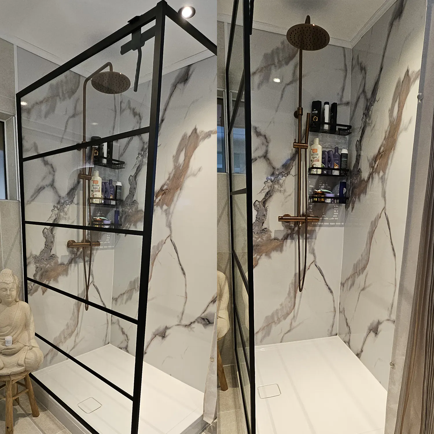 Het PVC Marmerlook Wandpaneel Hotel Chic biedt een luxe en stijlvolle uitstraling, perfect voor uw badkamer, douche en keuken. Deze hoogwaardige PVC wandpanelen met marmerlook zijn ideaal voor alle ruimtes binnenshuis. Dankzij de eenvoudige montage en het gemak van op maat snijden met een stanleymes, kunt u deze panelen snel en gemakkelijk installeren. De panelen zijn eenvoudig te reinigen en geven elke ruimte een verfijnde en elegante uitstraling.